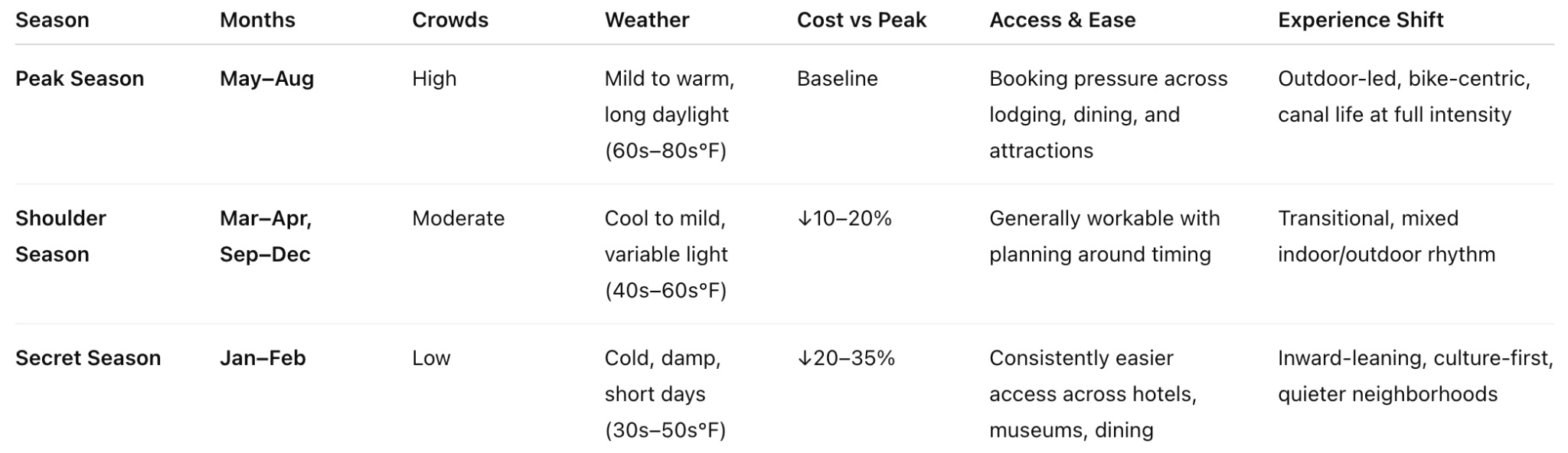 To understand how Amsterdam’s Secret Season compares to the rest of the year, the table below outlines how Peak, Shoulder, and Secret seasons function across all months — including differences in crowds, cost, and overall travel experience.