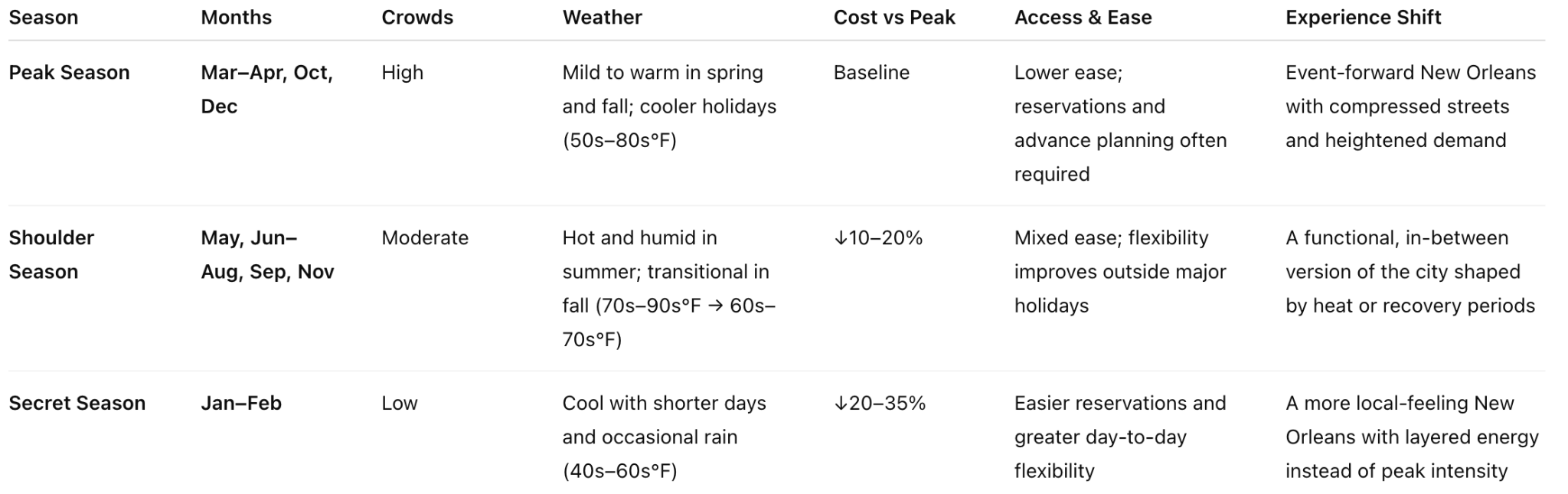 This is New Orleans’ destination-level Secret Season guide — designed to help you decide whether visiting during the quieter winter months actually works for you. To understand how New Orleans’ Secret Season compares to the rest of the year, the table below outlines how Peak, Shoulder, and Secret seasons function across all months — including differences in crowds, cost, and overall travel experience.