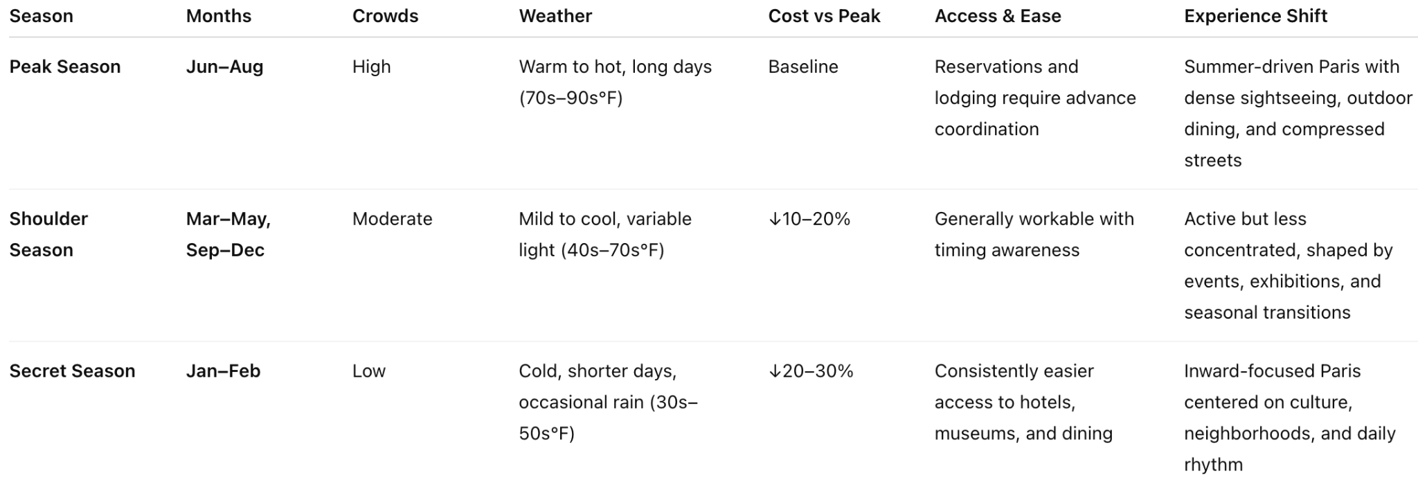 This is Paris’s destination-level Secret Season guide — designed to help you decide whether visiting during the winter months actually works for you. To understand how Paris’ Secret Season compares to the rest of the year, the table below outlines how Peak, Shoulder, and Secret seasons function across all months — including differences in crowds, cost, and overall travel experience.